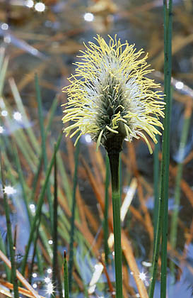 The tussocks, stems and narrow leaves of the plant appeared already when snow and ice were still there. The modest but decorative grey inflorescence spikelets are out, dappled with yellow stamens in places. It is spring in the bog.