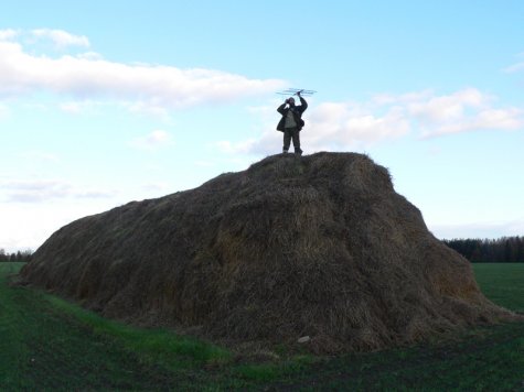 But we didn't hear the signal there. We discussed how woodpecker voices in the forest are very similar to the signal we were looking for and we began the walk back to the car. Halfway toward the car I thought I heard something, and Valeri agreed (after a day of looking for something, the mind can play tricks on you…). We climbed up a nearby haystack:
