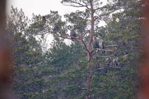 Morning line-up: 9 white-tailed eagles in the pine crown