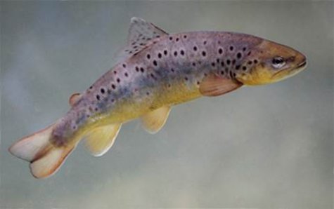Alevín de trucha. No es posible distinguir por el aspecto exterior, si son alevines de trucha de río o trucha marina