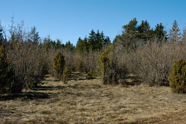 2. Alvar shrubland or alvar scrub is the first stage of the overgrowing of alvars. The most widespread type of alvar shrubland is juniper alvar – alvar shrubland dominated by juniper. In addition to juniper, the shrub layer may include dog roses, common and alder buckthorns, fly honeysuckles, hazels, etc. Juniper alvar is found in smaller patches all over the North Estonian Klint but the larger localities are connected with Northwest Estonian islands (Osmussaar, Suur- and Väike-Pakri). Also hazel alvar, i.e. alvar shrubland dominated by hazel, is found on the North Estonian Klint Plateau to a small extent.