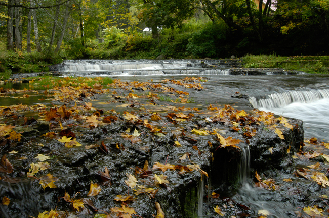 Joaveski Cascade on the Loobu River in Lääne-Viru County consists of 8 lower (0.5–1 m) limestone escarpments distributed over the distance of 150 m, with the total drop of 5.4 m. Before the construction of a cardboard factory and power station (1924), the river had also a fall with a higher escarpment (app. 3.5 m). Limestone for construction was extracted straight from the riverbed and the fall turned into a cascade. The small power plant was closed in the meantime but reopened in 1999 and now the cascade has to share its scarce water with the power station again.