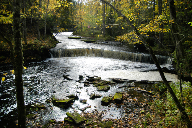 Keila Waterfall is located on the Keila River in Harju County, at where the river descends from the klint plateau into a small klint bay. It is the second-mightiest waterfall in Estonia after Jägala (6 m in height, up to 60 m in width, average discharge 6.5 m3/s, maximum up to 150 m3/s). The waterfall escarpment is an outcrop of rocks from hard limestones of Kunda Stage of the Middle Ordovician (the upper 2.5 m) to glauconite sandstone of Hunneberg Stage in the bottom part of the escarpment. The waterfall is retreating at a rate of app. 10 cm a year (Miidel 1991).