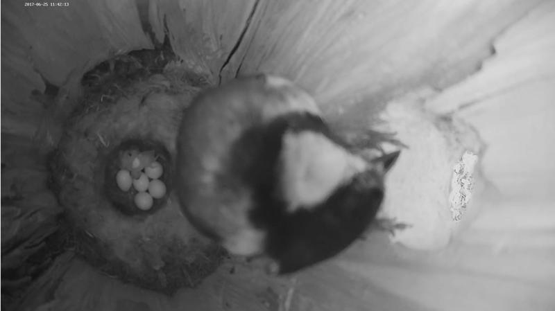 Am Sonntag Nachmittag (25. Juni) konnte das Schlüpfen der Küken im Baumstammnest beobachtet werden. Es war überraschend, dass die Küken genau dann schlüpften, da die Kohlmeise das letzte Ei, das achte, erst am 16. Juni ins Nest legte. Übliche Kalkulationen sagten voraus, dass die Küken nicht vor dem 28. Juni schlüpfen würden (lesen Sie hier: Wann beginnt denn eigentlich eine Kohlmeise mit der Brut? )