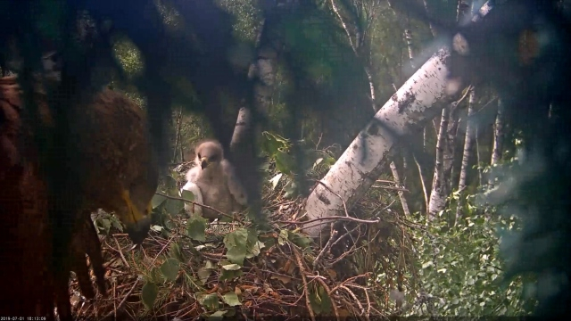 Kogu pesitsusaja on vanalinnud hoidnud pesa roheliste okstega kaetult. Ainus kotkapoeg kasvab ja areneb vanalindude hoolitsedes.