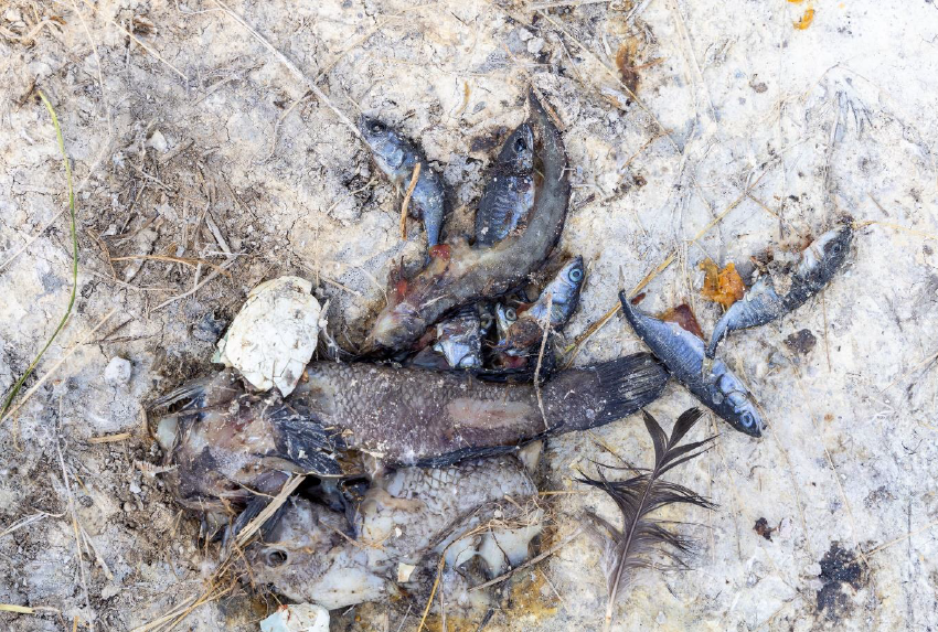 Inimese poolt tapetud kormorani pojad Sangelaiul. Kõrval vanalindude poolt toiduks toodud ümarmudilad ja ogalikud. 2022. Riikliku seire käigus tehtud foto : Mati Kose