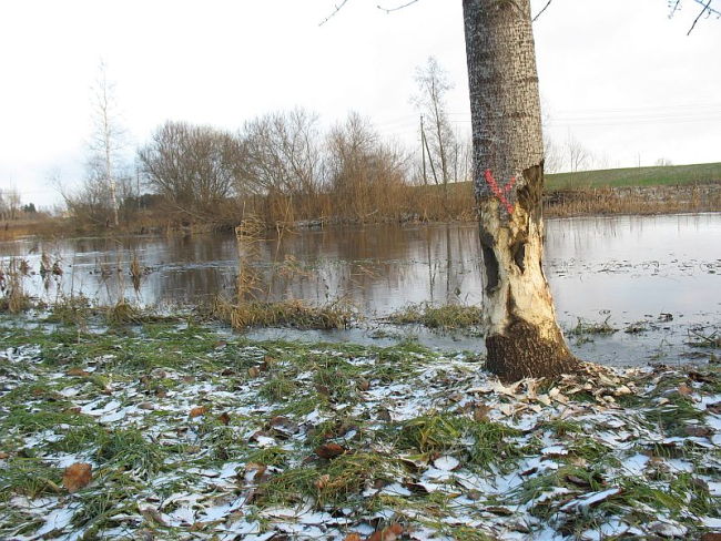 Kopra poolt kahjustatud ja inimese poolt märgistatud haab Pedja jõe kaldal