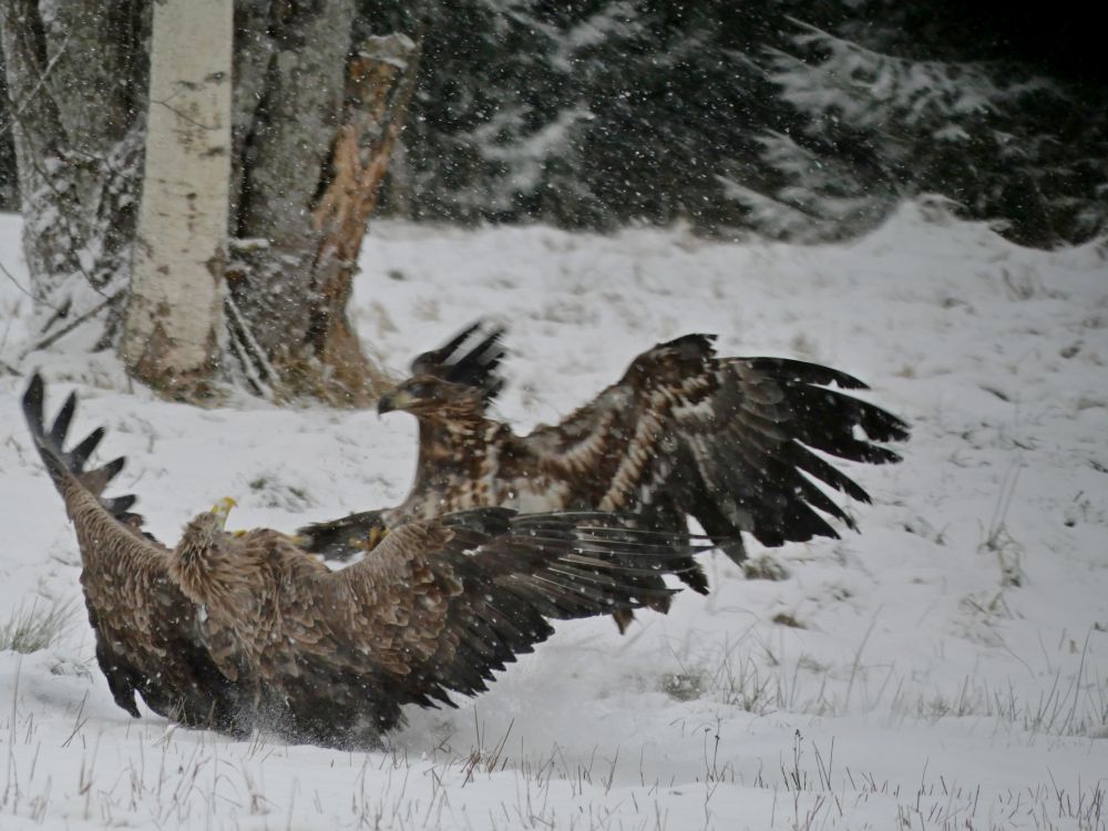 Nüüd ilmus kohale suur pirakas merikotka noorlind, kes lõi rõngaste läikides vanalinnu platsilt minema ning platseerus ise peremeheks. Lund aga sadas ja sadas, nii otsustas mingil hetkel "linnuke" puu otsa lennata ja kössutas seal ligi tunni.