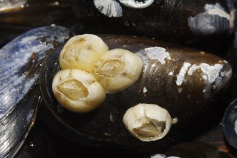 The common or edible mussel is oblong, the front end tapers off markedly. The colour of the shell is blackish blue and the length two-three centimetres. Edible mussels live in sometimes quite large colonies fastening to hard bottoms with threads of a horn-like material (byssus threads). When in place they feed on suspended solids filtered from the water. Among fish they are food for flounder and turbot, and important for eiders among the diving ducks. Many have bought mussels in the shops, the contents in the tins are caught elsewhere in the world for instance in Denmark, where the salt content of the sea water is greater and the mussels of commercial size.