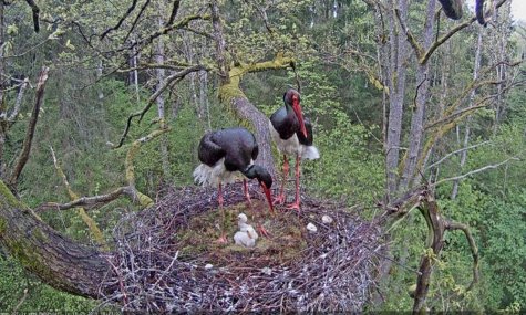 Rainy days, and the downy-feathered storklets must be covered against the rain. The oldest storklet was hatched on May 11th, the next on May 13th, in early morning – thus almost one week old.