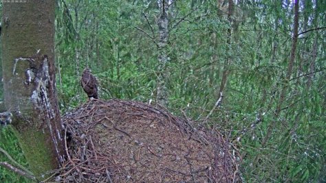 The camera shows a rather empty nest, the young buzzards clamber around in the nest tree branches and nearby trees, and they are already busy with flying exercises….