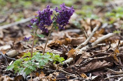 The common corydalis or bird-in-a-bush (Corydalis solida) flowers before the leaves spring out on trees, filling out the white-yellow-blue colour range with violet hues. The rarer Corydalis species, the intermediate corydalis, is also violet; the two can be distinguished by their leaves – the bracts of the intermediate corydalis are whole, those of the common corydalis deeply lobate. Some more about the leaves: the larvae of the clouded Apollo butterfly (Parnassius mnemosyne) feed on them. Keep watch where the plants grow, after their flowering you may see these rare butterflies around.