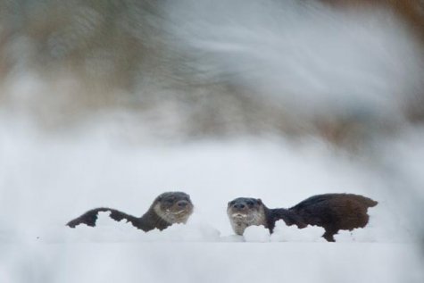 Otters know how to enjoy winter and the snow. Our largest water-living predator can be seen in the short winter days rambling along river banks, sometimes frolicking in the snow with the youngest offspring of the family. The female otter and the young born last year move together. Otters forage for food in water and the dense outer layer of guard hair of the fur is dried by rolling round in the snow.