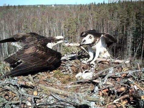 ESTLAT Eagles. El territorio de nidificación, donde está situada la Cámara 2 es, uno de los más antiguos conocidos y con mayor tasa de éxito del sur de Estonia. El año pasado las águilas pescadoras construyeron aquí un nuevo nido pero con las tormentas otoñales, se desprendió del árbol, por lo que construimos un nido artificial sobre el mismo árbol durante el invierno. En la primavera siguiente, después de la instalación de la cámara, se vio que la misma pareja tenía otro nido a unos 4oo metros de distancia y las águilas pescadoras decidieron utilizarlo ese año. Por ello, desde esta cámara es posible que no veamos con mucha frecuencia águilas pescadoras pero en cambio, se puede disfrutar de una estupenda panorámica y, entre otras cosas, oír el estruendo de los maniobras de las Fuerzas Armadas de Estonia. El segundo nido es también artificial, lo construimos a unos 200 metros de otro nido que se deshizo el año pasado. Hace un año, esa pareja de águilas tenía dos pollos. Cuando el 19 de abril vimos por primera vez la imagen, el macho estaba ya en el nido y el 23 de abril llegó la hembra.