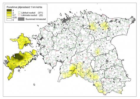 Mapa de la distribución del ciervo europeo (número de ejemplares/ km2) en Estonia correspondiente al conteo por cuadrículas en el invierno del 2013. Fuente: Agencia de Medio Ambiente