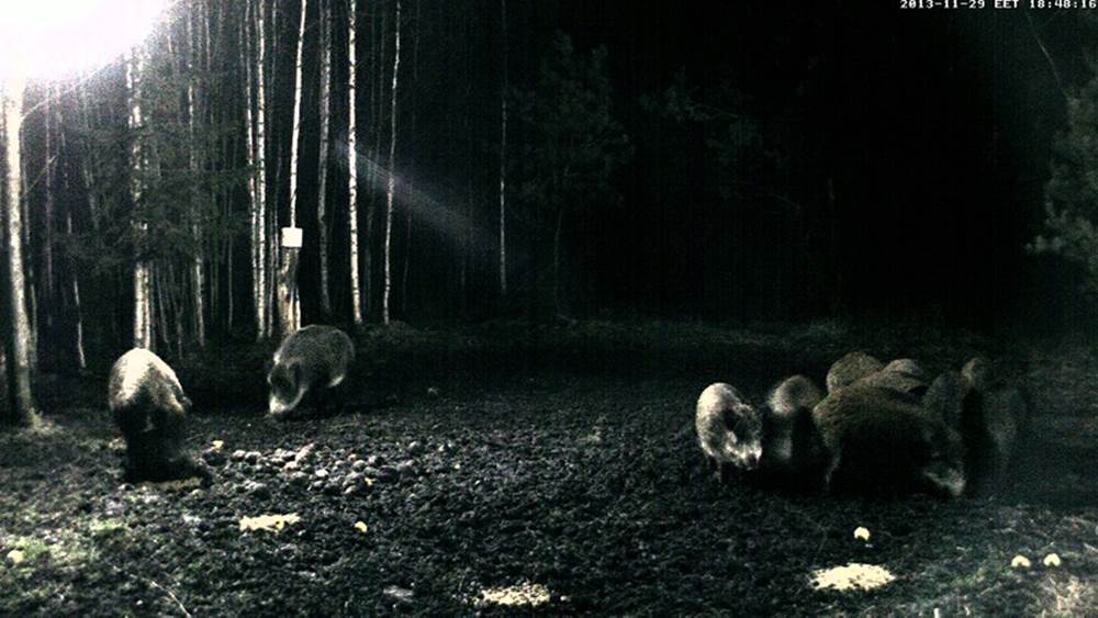 A la seis y media estaban aquí. Dos grandes hembras (izquierda) con su piara de nueve miembros. Debido a que la cámara web y la iluminación nocturna llevan ya varios días conectados, los animales se han acostumbrado al lugar. Veamos quién más aparece.