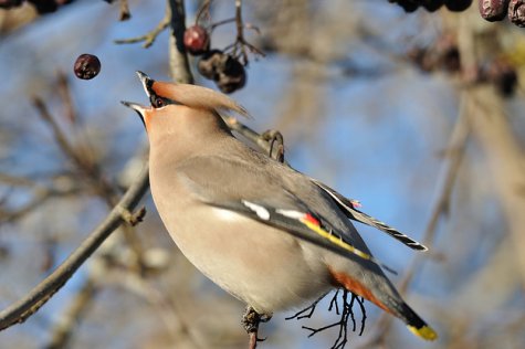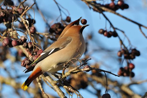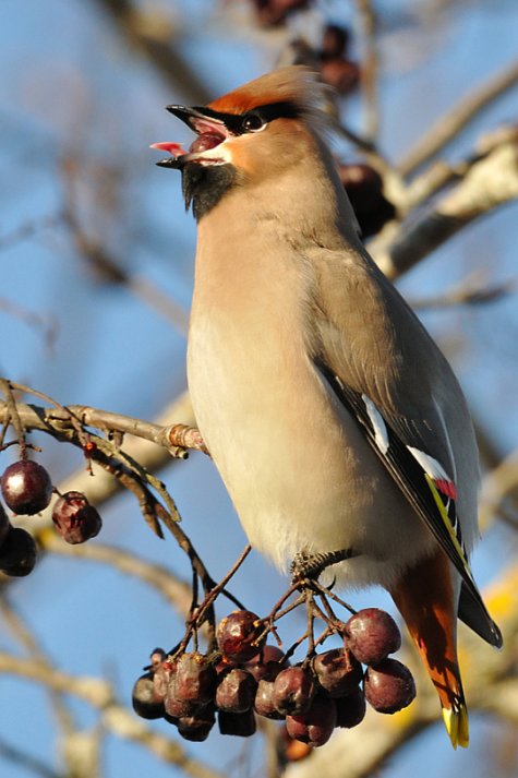 Die Seidenschwänze hatten ebenfalls Schwierigkeiten, die großen gefrorenen Beeren zu schlucken. Wie die meisten Vögel haben Seidenschwänze zwei nach hinten gerichtete Widerhaken auf ihrer Zunge. Mit diesen bekommen sie besseren Halt an einem Bissen und können ihn zum Hals dirigieren. Wenn die Zunge steif vor Kälte wird, fängt das Futter im Schnabel an herumzurollen und geht nicht mehr nach unten. Die Seidenschwänze versuchten durch in die Luft werfen und wieder auffangen die Beeren in eine bessere Position zu bringen. Aber das Mundwerk, ungeschickt durch die Kälte, war nicht mehr so flink beim Jonglieren - ein großer Teil der aus den Büscheln gegriffenen Beeren, fielen einfach auf den Boden.