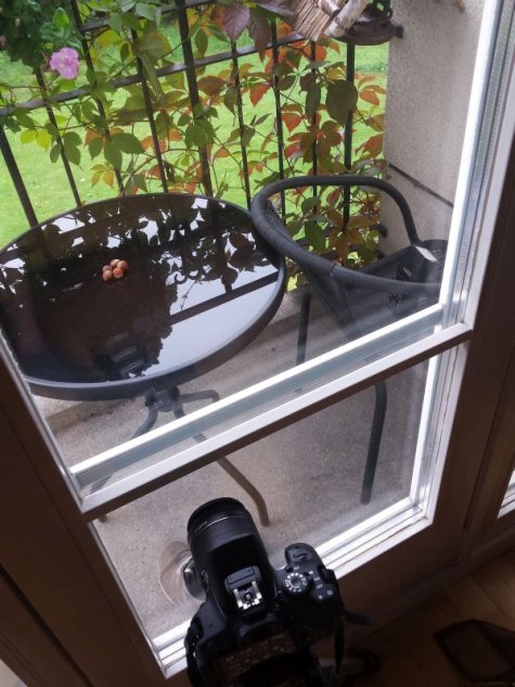 Natürlich musste ich Vorbereitungen treffen, um möglichst gute Fotos machen zu können. Nachdem die Aktivitäten des Eichhörnchens hinter Glas stattfanden, wurde eine extra Beleuchtung benötigt: Das Blitzlicht positionierte ich auf einem Stuhl auf dem Balkon. Ich legte die Nüsse auf den Tisch, nachdem ich sie sauber gemacht hatte und die Kamera war im Zimmer auf dem Stativ. Alles was noch zu tun war, war zu warten.
