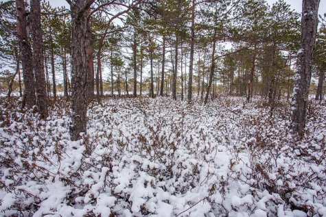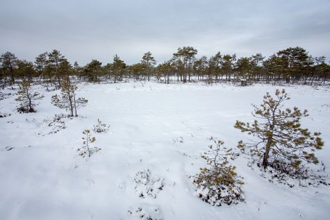 Die Erhebungen des Soosaare Moors sind extrem nach beinander. Von jedem Wasserauge ist das nächste schon sichtbar oder sogar die nächsten zwei oder drei. Schade, dass das Wetter so grau ist. Der Schnee, der die Erhebungen bedeckt, spiegelt Vermischungen mit dem Weiß des Schnees in der Umgebung und das wiederum mit dem Grau der Wolken.