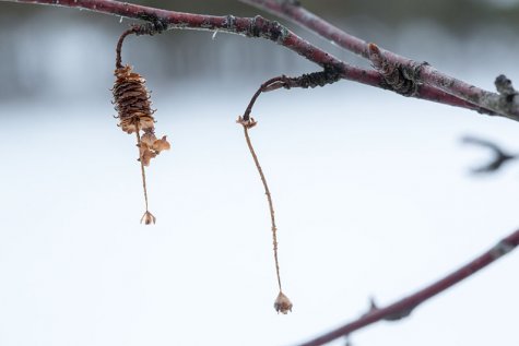 Die Moorbirke steht in der Zeit der Samenausschüttung. Aus den Kätzchen quellen die Samen auf die Schneekruste, von wo der Wind sie davonträgt.