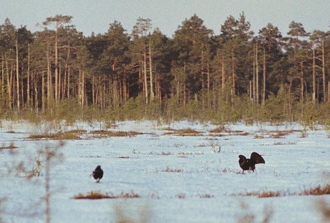 Beobachtungen in der Birkhuhn Hütte hat uns viele schöne Bilder und Erinnerungen beschert. Ja, hauptsächlich nur das, denn die Fototechnik dieser Zeit hat keine Fotografie in der Dämmerung erlaubt. Das Foto zeigt ein seltenes Phänomen in der Estnischen Natur: einen „Rackelhahn“ oder Birkhahn König (rechts) der an einen Birkhahn erinnert, ist auf dem Birkhahn Balzplatz gelandet. Rackelhahn ist ein deutscher Begriff für ein Hybrid zwischen Birkhahn und Auerhenne.