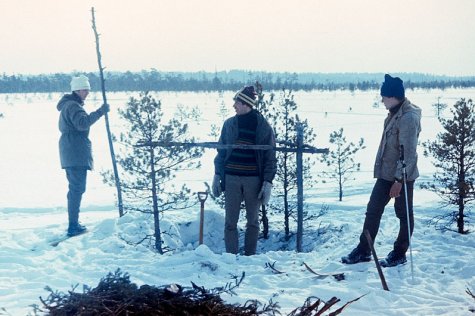 Bau des Roikaonn. Wegen dem Schnee im März 1985 mussten wir mit dem Graben einer Grube anfangen. Die Stützpfeiler einzusetzen geht voran. Die Hütten-Erbauer von links nach rechts: Kristel Vilbaste, Urmas Sellis, Olav Sarv.
