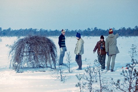 Der Bau der Birkhuhn Hütte war ein Stück Kuchen verglichen mit dem was später auf den Beobachter in der Hütte wartete. Eine der Studentinnen in unserer Gruppe – jetzt Naturjournalist und Schriftsteller Kristel Vilbaste – kommentiert die Beobachtungen der Birkhahnbalz damals wie folgt:“Rückblickend auf all das Zusammenkauern in dem Unterschlupf, muss ich zugeben, dass ich wirklich nicht mehr zurückkehren möchte, um in der Birkhuhn Hütte zu sitzen. Es war so kalt, dass die Kälte bis ins Mark drang. In der Birkhuhn Hütte zu sitzen ist größere Selbstquälerei als auf glühenden Kohlen zu laufen oder in einer Quelle zu schwimmen. Trotz aller Schönheit und allem Zauber.“