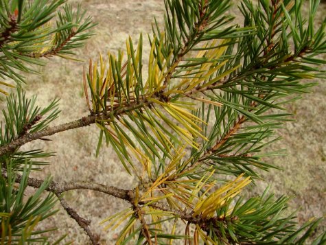On some branches all needles go yellow, but these wholly yellowing branches have become so shadowed over the years by larger branches in the crown that enough sunshine no longer reaches them.