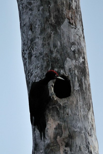 A black woodpecker inspecting its old nest hollow. The flight opening of black woodpecker nests is an oval. The lower part of the opening is made at a slight angle so that rain water will drain outwards.