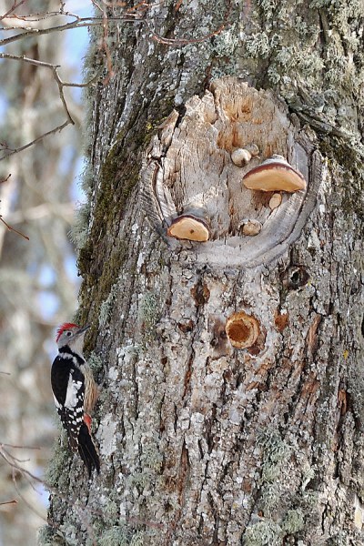 The middle spotted woodpecker started building its nest during the first days of April. The woodpecker with the small beak would not have the strength to hollow out sound oak wood, the nest is always made in decaying parts of the trunk.