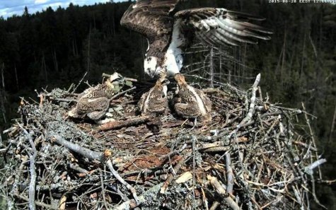 The three offspring of osprey pair Irma and Joosep, with excellent protective plumage, in the background in the nest.