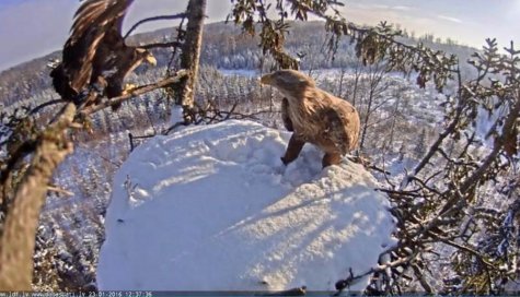 Two young white-tailed eagles were at the nest looking it over. You can see for yourself that the tail feathers have not turned white yet.