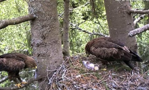 .Although the age difference between the chicks is not very big, it is likely that only one of them will grow up – usually it will be the first-hatched one. In literature it is stated that the older chick crawls on to the younger one so that the younger gets no food and dies. If this will happen in our camera nest we will soon know. But the strategy of raising only one chick has kept the lesser spotted eagle population strong and stable, and interfering in this is not wise. And in a few percent of the successful nestings two chicks do grow up ...