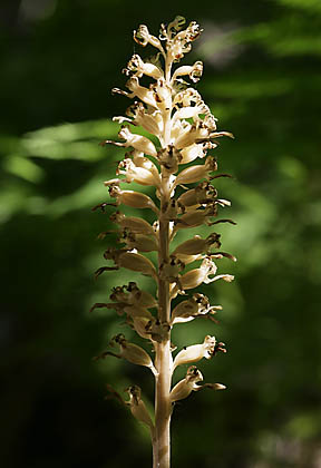 The third star actor of the orchid week is the bird’s-net orchid. A strange member of the beautiful orchid family, somehow like a poor Cinderella in the backyard of the King’s palace. Finding it is not difficult, it only needs some experience and luck in coming across it. It is a shadow-loving little plant that is nearly without any chlorophyll. It likes to grow in broad-leaf forests, ash grooves, and often in young, dense spruce woods with poor light, where I have found it most frequently. In my opinion there are no ugly flowers or plants, each of them have their own beauty. When studied closely, and when sunlight unexpectedly finds it, the yellowish-brown flowers of the bird’s-nest orchid have a golden shimmer. The stems of some plants seem to burst with vitality.