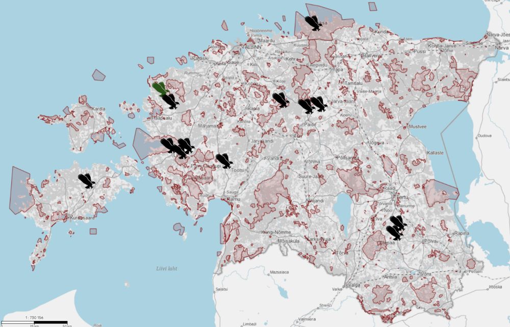 Kaardi Eesti teadaolevatest raisakotka vaatlused (2024. a maikuu vaatlust tähistatud rohelisega); punasega tähistatud kaitsealad