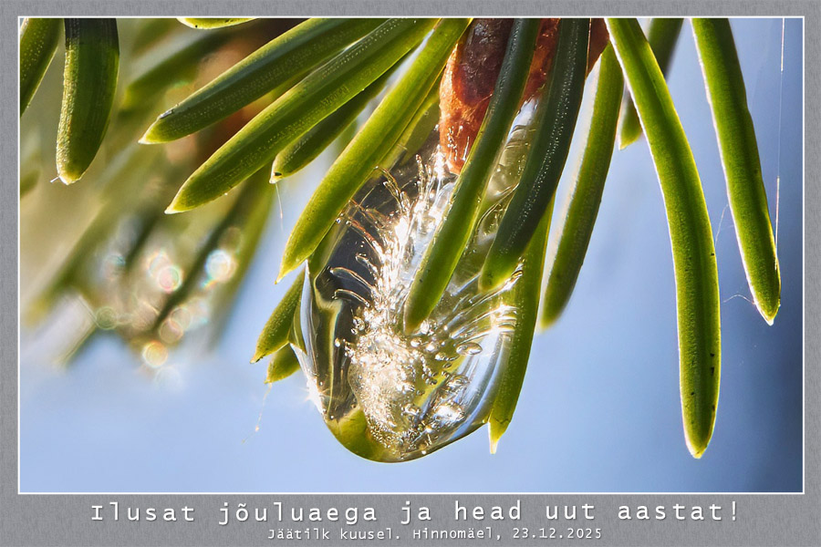 Tänavusel Loodusemehe jõulukaardil näeme kuusel rippuvat jäätilka, mis on pildistatud eile (23.12). Lumevalged seekordsed jõulud küll ei ole, aga kauneid jäämustreid jagub ikka!