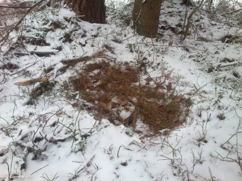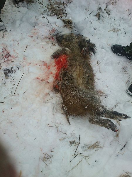 Ainult paarsada meetrit mööda jälgi kõndides avastasime kriimsilmade peatuspaiga. Palju erineva vanusega jälgi, märgistamiskohad ja magamisasemed. Hallivatimehed olid lahkunud siit alles hiljuti. Otsisime veel ja leidsime värskelt puhtaks näritud metssea põrsa kolba. Järjekordse verelaigu ja karvatuustide juures märkasime lohistamise jälge. Pikki seda natuke edasi minnes oli maas värskelt murtud metsseapõrsas. Natuke juba söödud, kuid veel soe. Alles nüüd taipasime, et olime suures avastamistuhinas võsavillemid saagilt minema peletanud. Tegime veel mõned kiired võtted ja tulime ära, et hundid saaks oma asju edasi toimetada.