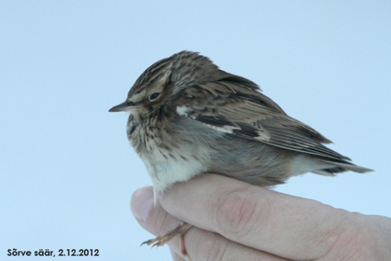 Heidelerche in Sõrve säär 02.12.2012. Am Morgen waren 4 Heidelerchen nahe dem Leuchtturm beschäftigt. Eine davon war sichtbar geschwächt und ließ sich mit der Hand fangen. Traurigerweise starb der Vogel, offensichtlich durch Verletzungen (ein Bein fehlte), Kälte und Hunger (Foto: Uku Paal)