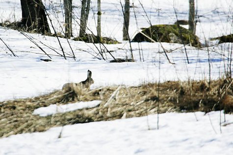 If the brown hare is mostly seen in open landscapes, then the mountain hare keeps to forests dominated by conifers; sometimes it is seen moving along the open power lanes there. The mountain hare is quite well adapted to a diet of twigs in winter but in a snowy winter getting at the food is still not easy. It goes foraging at dusk and in night. On the winter menu are the smaller twigs of trees and bushes; shoots, buds, and also the bark: from birch, willows, aspens ... Food requirement is around half a kilo per day. The food is passed through the digestive system twice – read about the brown hare: