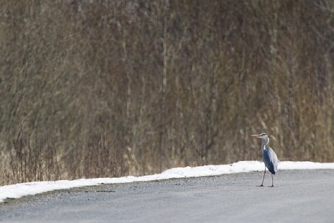 The snow cover is still quite thick, and snowdrifts at the roadsides are large and high. Arriving migrating birds often land on the roads and may not move very quickly out of a vehicle’s way.