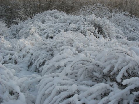 Kerge õhuline lumi on jäänud hundipaju põõsastele püsima